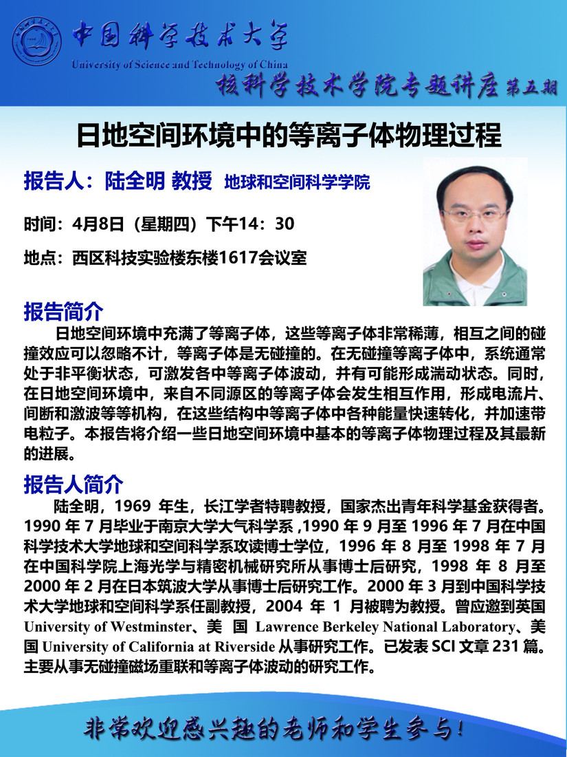 2021年04月08日(周四)14:30 地球与空间科学学院 陆全明 教授:日地空间环境中的等离子体物理过程