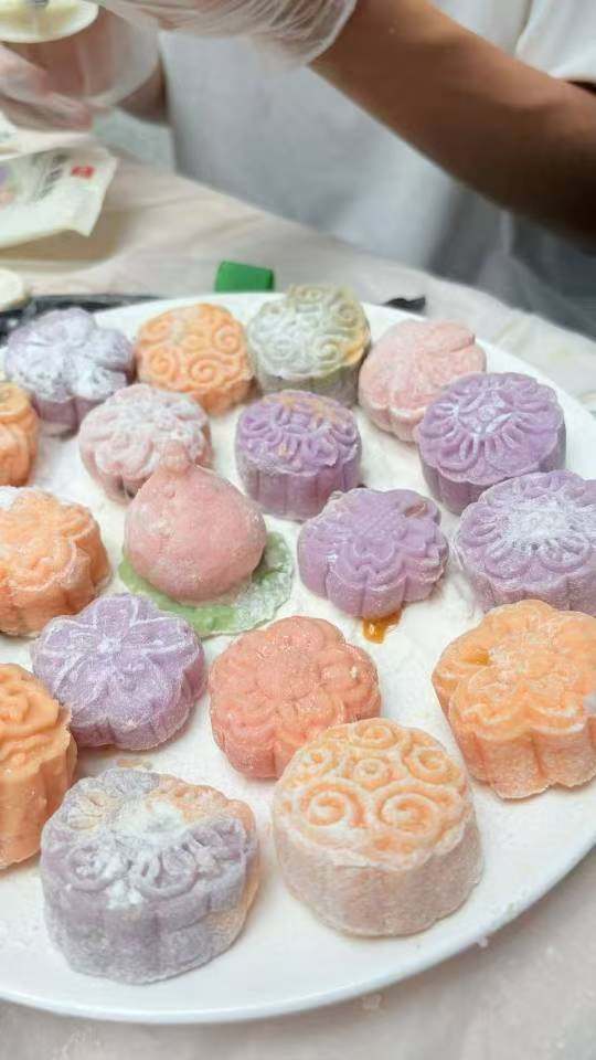 志愿者在入口处进行月饼制作教学,详细演示揉制面团、调配馅料、压模成型等步骤。同学们认真观摩、积极互动,现场气氛热烈。教学环节结束后,同学们分组动手实践,利用准备好的面粉等原料,自由创作各式月饼。造型各异、色彩缤纷的作品不断涌现,展现了大家的巧思与协作精神。