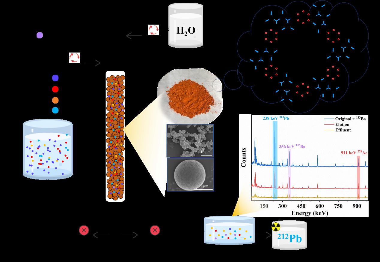 针对靶向α放射治疗核素212Pb的母体核素228/224Ra的分离与纯化问题,陈志团队开展了深入研究,利用冠醚单元作为功能基团,设计并合成了具有高比表面积与多孔结构的共价有机聚合物微球材料。首次将其应用于从天然钍系中228/224Ra的分离。研究结果表明,该材料具有出色的热稳定性、吸附性能、辐射抗性及再生能力。在1 M HNO3强酸性环境下,对钡(镭的冷实验代替离子)吸附容量高达40.73 mg/g。材料经过700 kGy γ辐照后仍保持原始吸附容量的88%。在热实验中,该材料成功从278 Bq的232Th溶液中分离出164 Bq的228Ra,其中示踪剂133Ba的放化回收率达到93%。相关成果于9月28日以“Advanced Strategy for Radium Separation from Natural Thorium Using Crown Ether-Based Covalent Organic Polymer Microsphere”为题发表于国际知名期刊《Chemical Engineering Journal》上。
