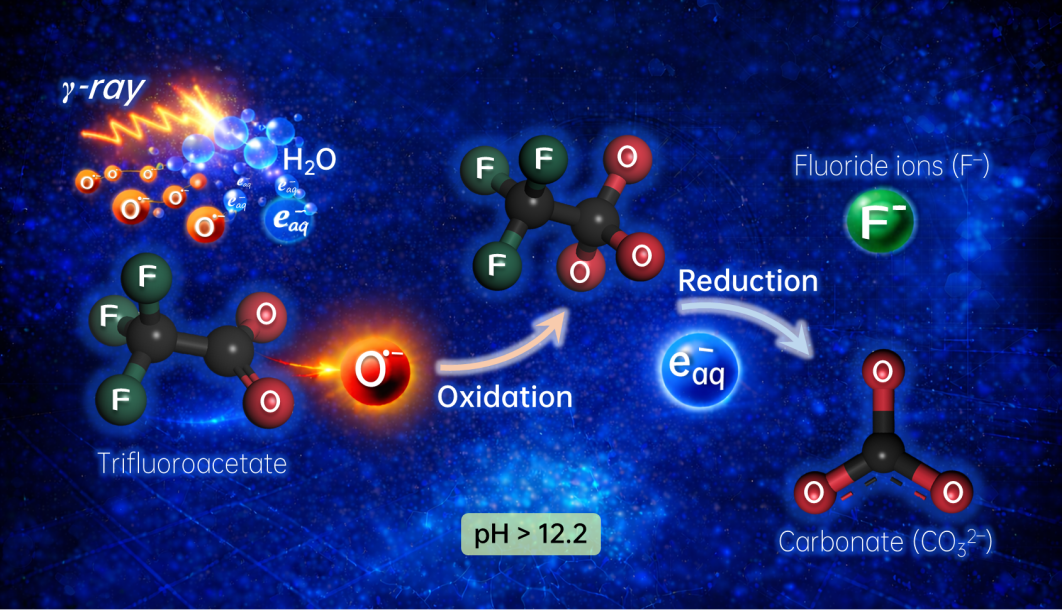 受地球早期海洋中天然辐射过程可清除有害物质的启发,研究团队利用高能辐射在水中产生的高活性物种,提出了由氧负离子自由基(O•–)和水合电子(eaq−)共同介导的氧化–还原协同降解机制。通过脉冲辐解等时间分辨研究手段,团队系统揭示了高能辐射诱导的自由基串联降解三氟乙酸的完整过程。研究发现,O•–能够优先氧化活化三氟乙酸,开辟了传统羟基自由基(•OH)难以触达的反应通道,并以较高反应速率生成关键中间体。该中间体进一步与水合电子反应,最终实现C–F键断裂,并完全矿化为氟离子和碳酸根。实验结果显示,在此协同路径下,三氟乙酸可在六小时内达到接近100%的矿化率。