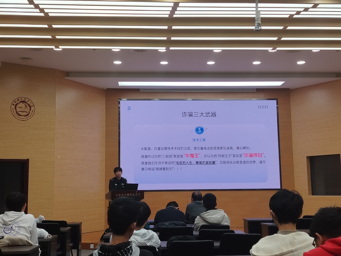 讲座中,民警紧密结合高校实际情况,以案说法,深入浅出地为同学们剖析了电信诈骗的种种陷阱。民警首先明确了电信诈骗的基本概念与严峻态势,随后重点解析了诈骗分子惯用的“三大武器”:通过非法渠道获取的精准个人信息、精心设计的心理操控话术以及伪基站、AI换脸等高科技工具,揭示了“量身定制”式诈骗的隐蔽性与危害性,并进一步说明了诈骗分子如何利用现代技术与人性的弱点实施犯罪。