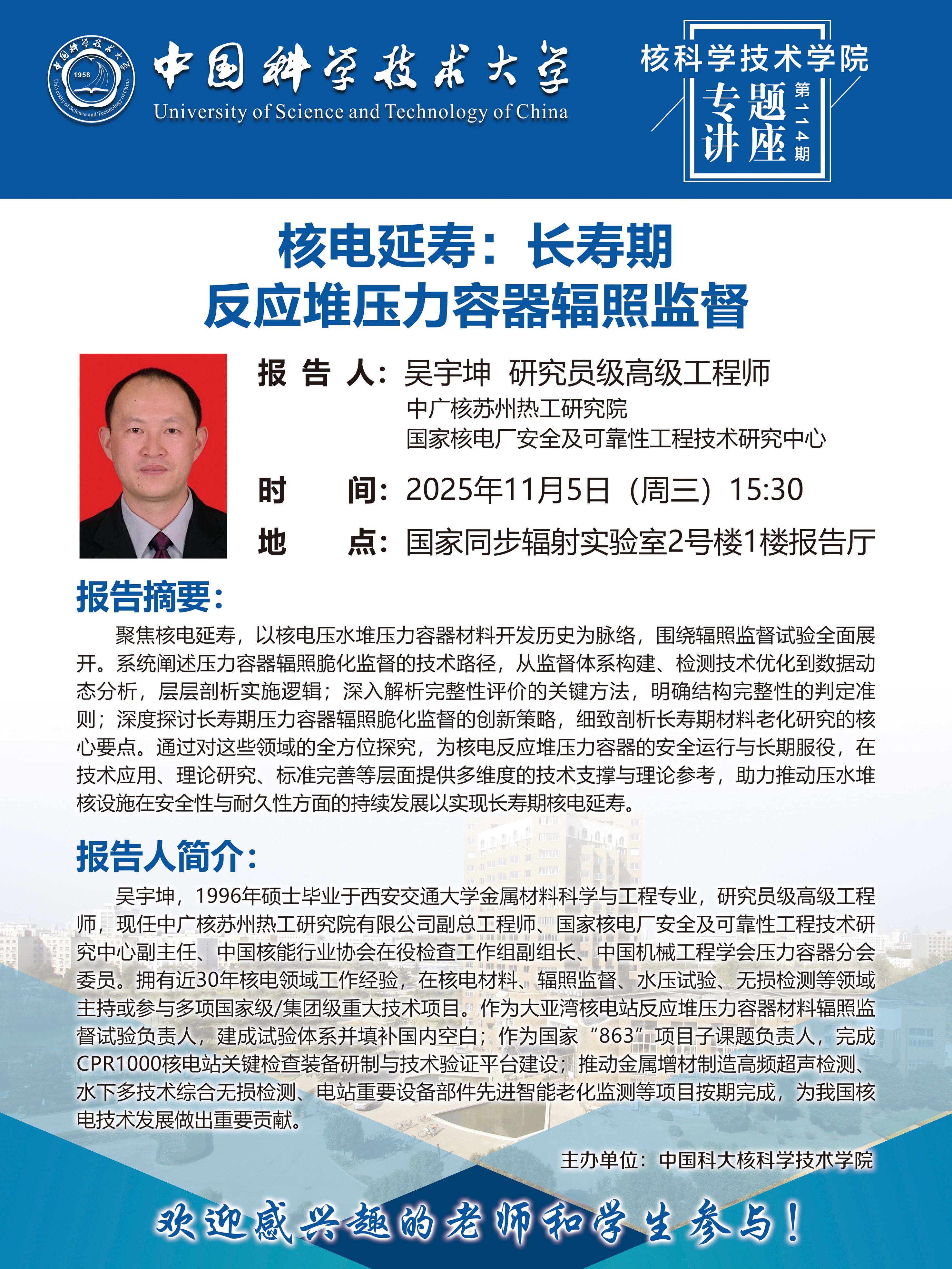 2025年11月05日(周三)15:30 核科学技术学院专题讲座第114期